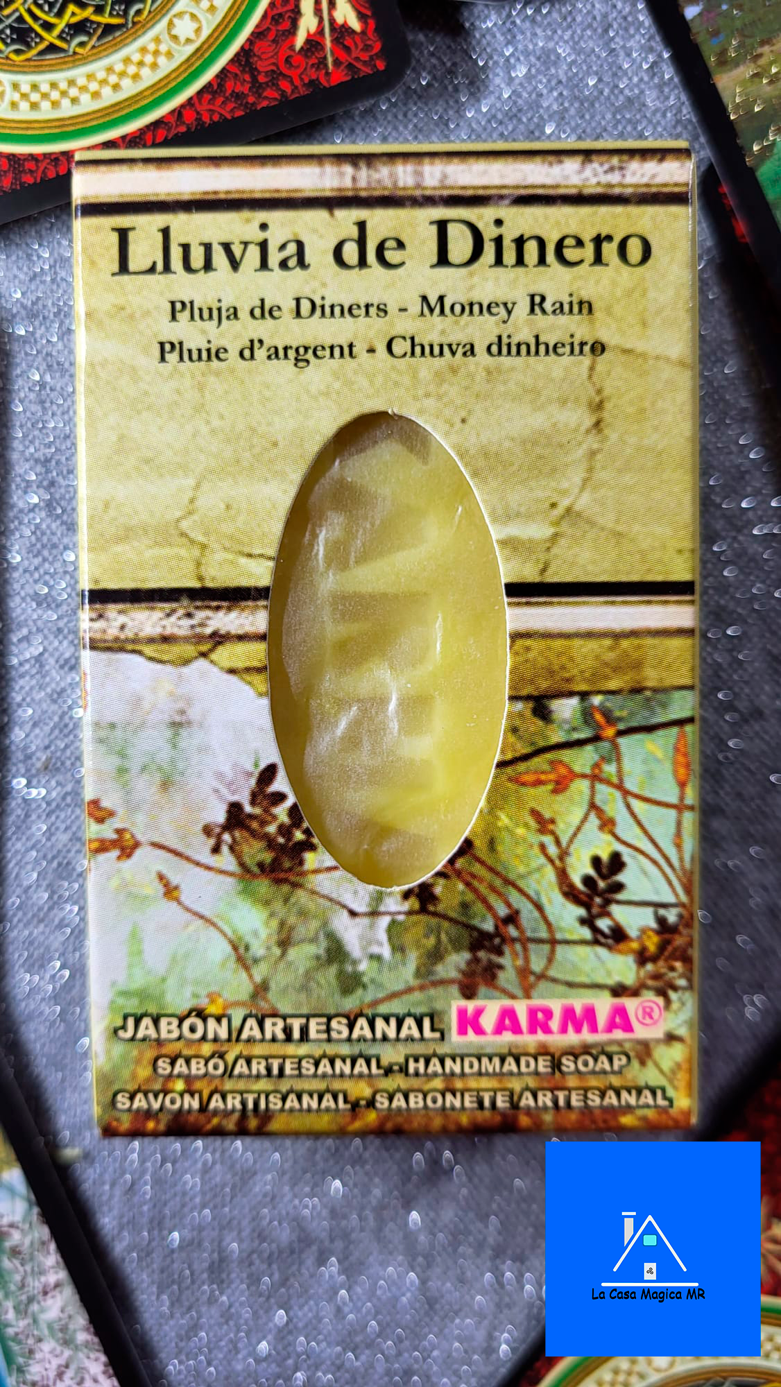 Jabón Lluvia de Dinero. Para conseguir que fluya positivamente la economía. Jabón fabricado mediante proceso artesanal y elaborado con ingredientes vegetales de primera calidad, suave y natural, y respetuoso con el medio ambiente. Este jabón utiliza antiguas fórmulas de santería, a base de hierbas y aceites esenciales. Así es como la verdadera magia es llevada al cuarto de baño, promoviendo el bienestar y produciendo un estado mental positivo que nos ayudará a atraer la prosperidad, el amor y la abundancia.